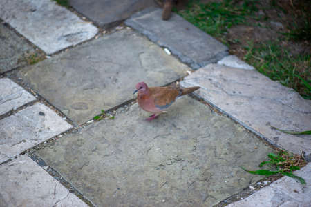 The laughing dove (Spilopelia senegalensis) sits on the ground close up photo