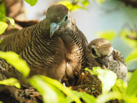 Close Up Of Two Birds, Baby Bird With Mother Portrait In Bird's Nest