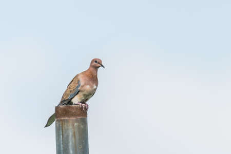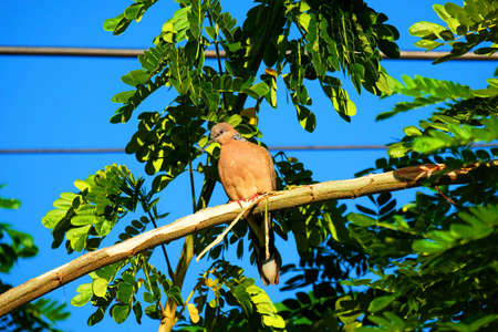 Side view of brown zenaida dove sitting on the branch of a tropical or Indian almond tree with blurred leaves in the background. Great for bird, animal or nature images, banners and posters.