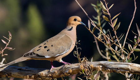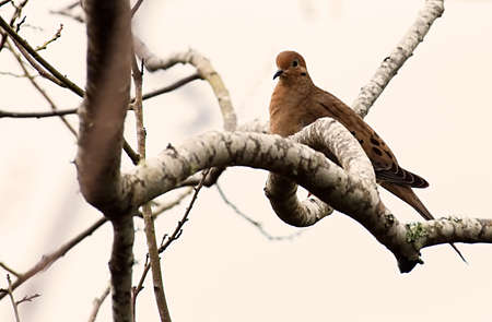 Mourning Turtle Dove (Zenaida macroura) resting on a tree branch in morning stillness. luminescent sunlight