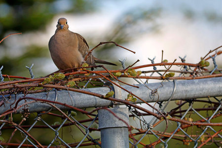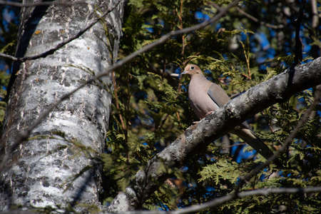 Mourning Dove, Zenaida macroura, perched on a branch in the sunlight with blue sky