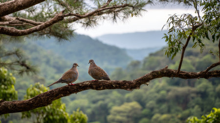 A pair of doves sits gracefully on a sturdy branch, overlooking a vibrant green valley surrounded by distant mountains, capturing the essence of tranquil nature.