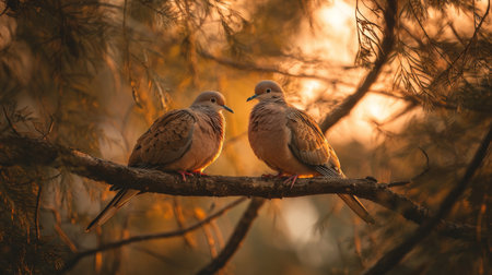 A beautiful scene featuring two doves sitting gracefully on a branch during sunset, surrounded by a warm golden glow that adds to the serene atmosphere.