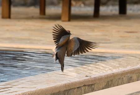 A graceful bird lifts off from the edge of a calm pool, its wings spread wide, as the sun shines brightly. The peaceful atmosphere creates a moment of beauty, reflecting nature's charm.