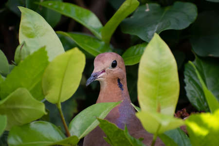 Side view of one brown zenaida dove showing head and upper body between blurred green leaves, plants and nature background.