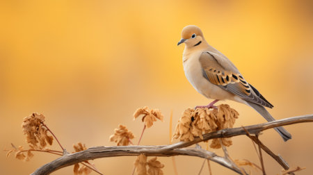 a dove perches on a branch with a flower in the background. this 32k uhd photograph showcases a light brown and blue color scheme, capturing the essence of environmental portraiture. the luminous color palette adds depth to the landscape photography, while the nature-inspired camouflage blends harmoniously with the light yellow and light bronze tones. ai generated