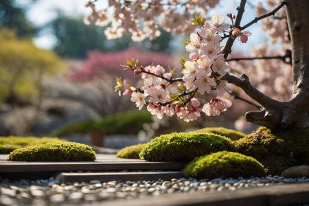 Beautiful Japanese garden with stone pathway and cherry blossom tree.