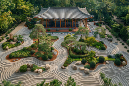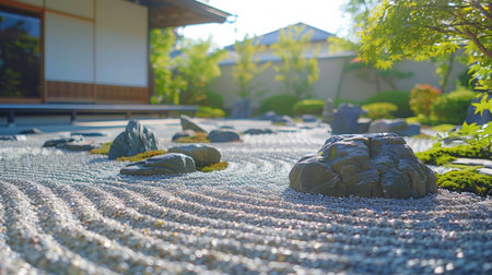 A serene Japanese Zen garden featuring meticulously raked sand and carefully placed stones, providing a tranquil space for meditation and relaxation amid lush greenery.