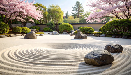 Experience the tranquility of a Zen garden featuring arranged stones and raked sand, inviting mindfulness and serenity amidst nature's beauty and artistry.