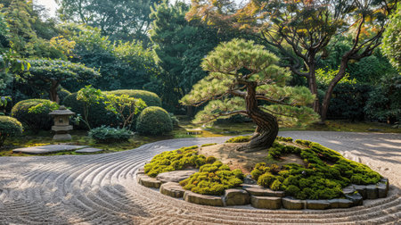 This image showcases a meticulously crafted Japanese Zen garden. The scene features carefully placed rocks and a gracefully shaped tree, all set against a backdrop of raked gravel. The composition is serene, with neutral tones and soft lighting that suggests a sense of peace. Suitable for editorial and commercial applications.