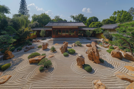 Discover a serene zen garden featuring a harmonious arrangement of rocks and lush greenery, surrounded by traditional architecture, inviting peace and tranquility.