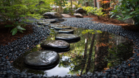 Discover a peaceful outdoor scene featuring a serene zen garden pathway lined with smooth stones, reflecting water, and vibrant autumn foliage. Ideal for nature lovers.