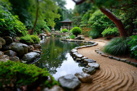 Tranquil Japanese garden with koi pond surrounded by lush greenery and serene landscape