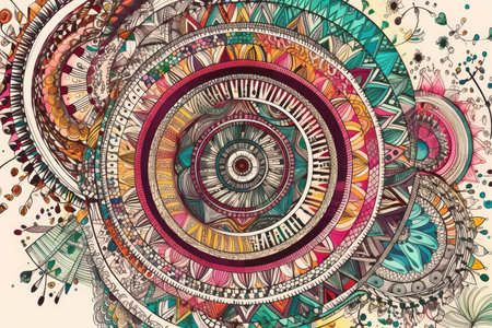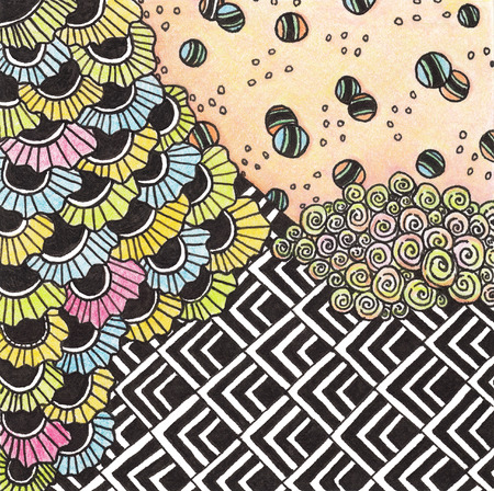 Colorful zentangle mandala with various shapes and patterns on a white background
