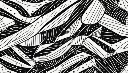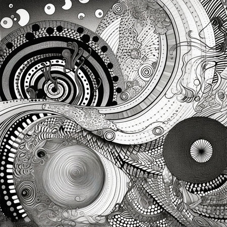 Detailed black and white abstract artwork featuring complex lines, curves, and shapes, creating an engaging visual experience for viewers.