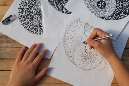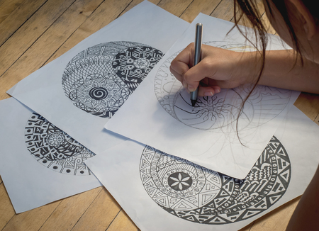 Hand of woman drawing yin yang for adult anti stress coloring book
