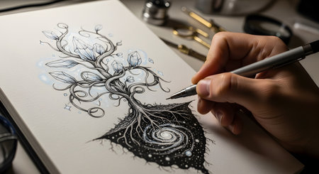 A person's hand is shown using a pen to draw a surreal illustration of a tree with crystals instead of leaves and roots that swirl into a galaxy. The artwork combines natural and fantastical elements, symbolizing concepts of creativity, imagination, and the connection between the universe and life.