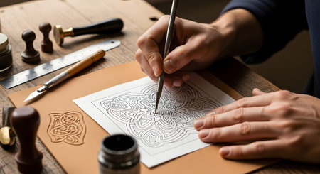 An artist's hands are shown meticulously drawing a complex Celtic knot pattern with a dip pen and ink on paper. The artisan's wooden desk is covered with tools of the trade, including wax seals, a cutting knife, and an embossed leather sample.
