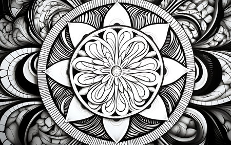 Intricate black and white mandala pattern with floral elements. That the image is generated using AI.