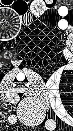 Intricate black and white design showcases various flowing shapes and patterns, creating a mesmerizing abstract visual that draws the eye.