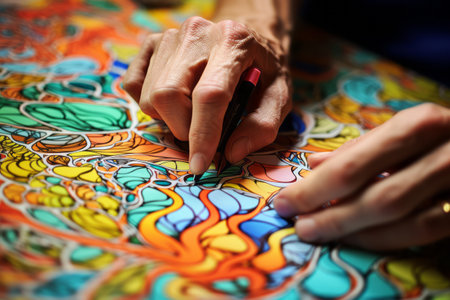 A close-up of a hand engaging in a colorful art project using vibrant markers. The creative workspace is filled with inspiration, showcasing tools for artistic expression.