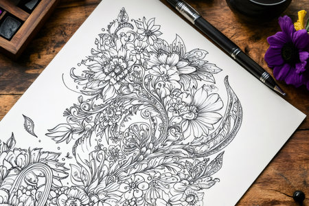 Intricate indian mehndi floral design displayed on a sheet of paper, ready for coloring, with art supplies surrounding it