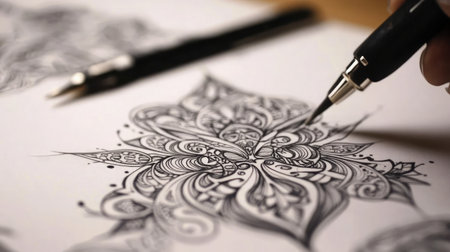 A close view of skilled hands drawing an intricate design on paper, showcasing artistic expression and the detailed process of creating art in black and white.