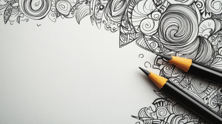 Abstract black and white doodles with two pencils