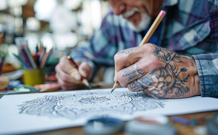 A close up of a tattooed man sketching intricate mandala designs with colored pencils on a workspace