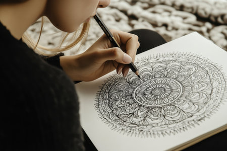 A woman is focused on drawing detailed mandala patterns in her sketchbook at home in a relaxed atmosphere.