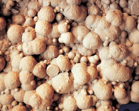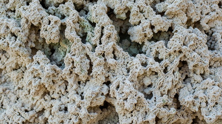 A detailed macro view of a rough, porous, and irregularly textured natural material in a light beige color.