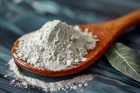 White powder with leaf on wooden spoon, high quality, high resolution