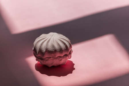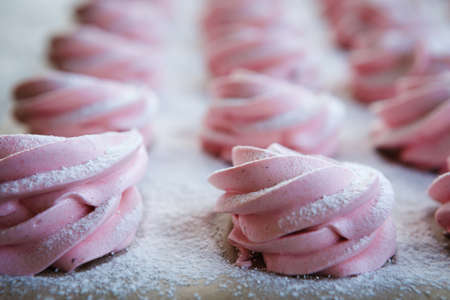 Pink raspberry marshmallow Zephyr sprinkled with sugar powder. Sweet dessert