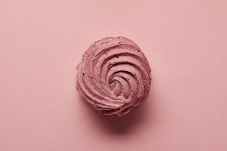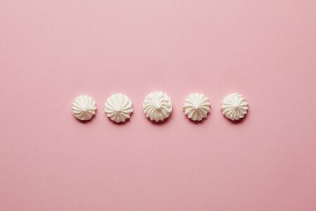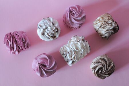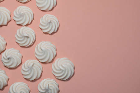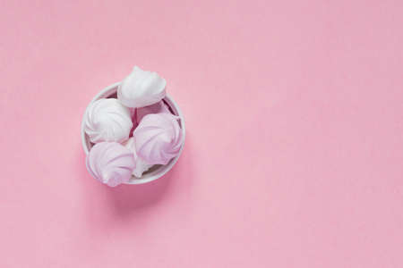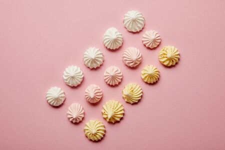 Colored small meringues on a pink background. Flat lay concept. Copy space