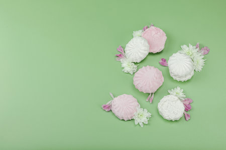 Fruit marshmallow with fresh flower petals on pastel green background. Lactose free vegan dessert, healthy lifestyle, flat lay, top view