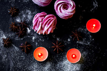 Many purple marshmallow on a dark surface. A contrasting picture.A work of culinary art