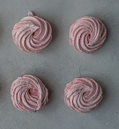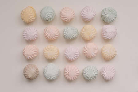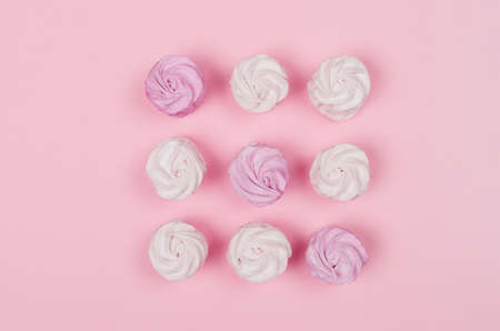 Meringue zephyr marshmallows lined up in a square on a light background. Mortgage the apartment. Pink sweet homemade marshmallow or marshmallow. Lots of sweet marshmallows. Top view