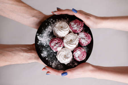 Man and woman holds zephyrs on plate together close up top view. Sensitive background of gift with love, romantic present, tenderness in relationship concept