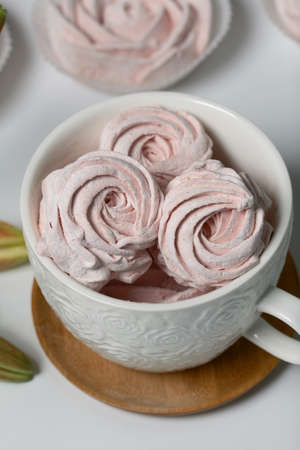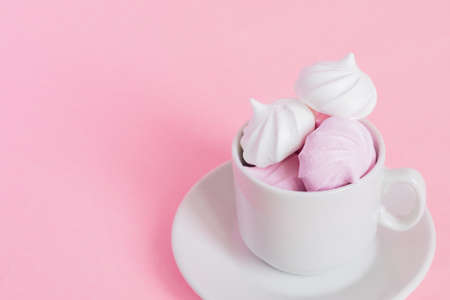 White and pink twisted meringues in a small porcelain coffe cup on pink background. French dessert prepared from whipped with sugar and baked egg whites. Greeting card with copy space