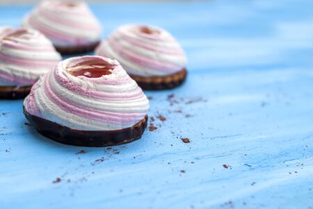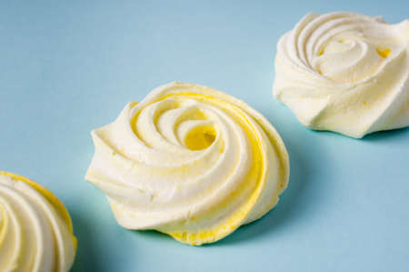 Homemade sweet colored meringue from eggs and sugar on blue background. Dessert.