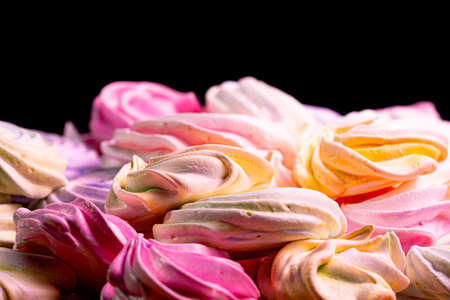 Swirls of sweet meringue on black background. Sweet meringue yellow, pink and purple color in confectionery. Sweet dessert, baking for childrens party. Close up shot of protein and sugar cookies.