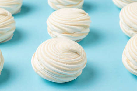 Freshly prepared meringue on a light blue background. Delicious sweetness of eggs and sugar.