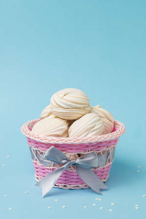 Pink basket with a gray ribbon filled with meringue on a blue background. Delicious sweetness of eggs and sugar.