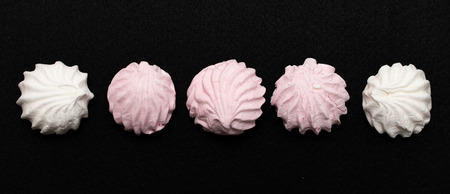 Pattern sweet marshmallows, candies on a black background, flat top view. Isolated minimal concept above decoration, view of pink marshmallow, food background