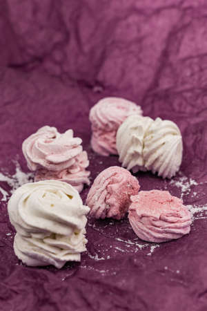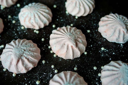 Pink marshmallow on a dark background. White and pink sweet homemade marshmallows or zephyr. The view from the top. Selective focus