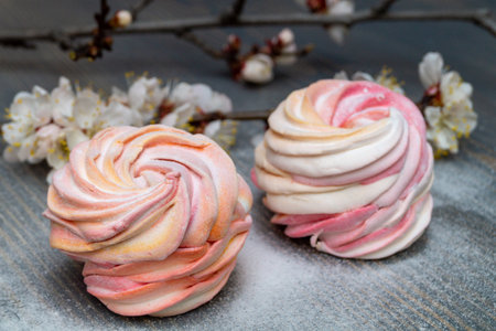 Delicious pink and white marshmallows on the table along with a blossoming branch of apple tree. Sweets.