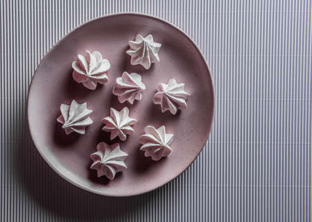 Close-up of few delicate pink meringue cookies on pink porcelain round plate. Textured white paper background with stripe pattern. Sweet background, flat lay, top view. Vertical orientation.