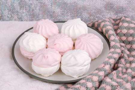Russian dessert zefir or zephyr on gray plate on pink fur background. Marshmallow and knitted scarf closeup picture.