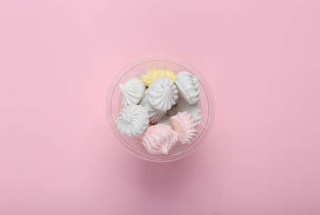 Plastic cup with Sweet colored meringue on pink background. top view. flat lay