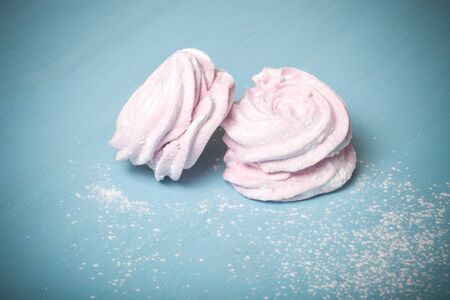 Fresh pink homemade zephyr - marshmallow on blue wooden table. Toned.